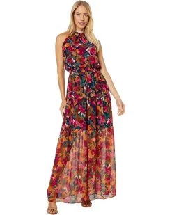 Vince Camuto Printed Chiffon Ruffle Neck Maxi with Smocked Waist | Dresses