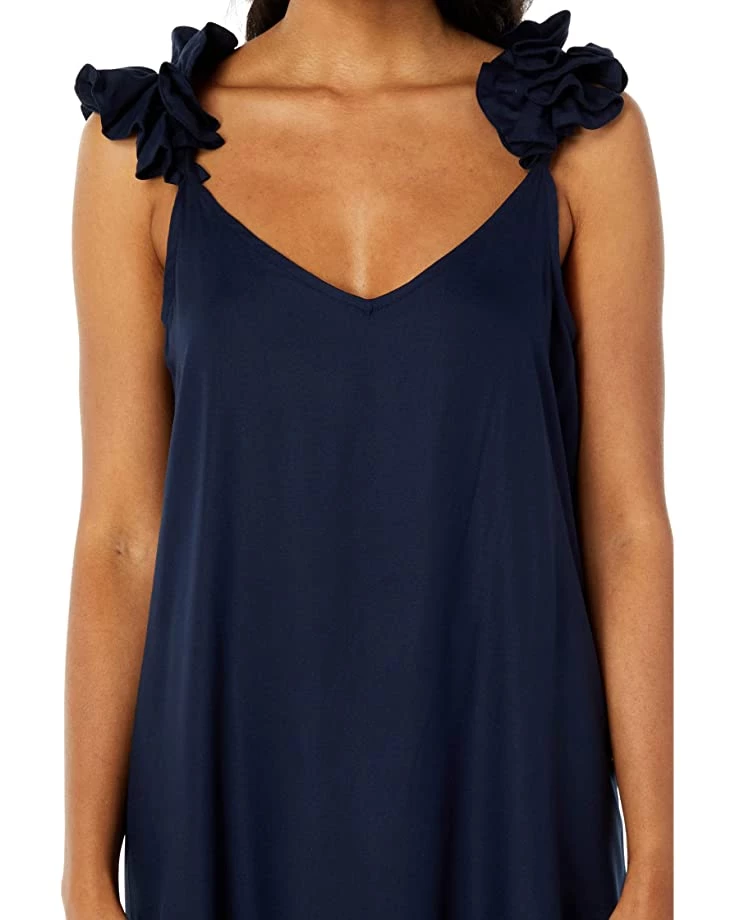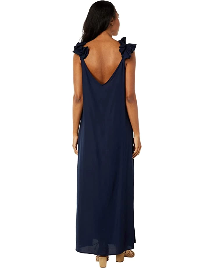 - Maxi length dress featuring plunging V-neckline and ruffled shoulder straps.